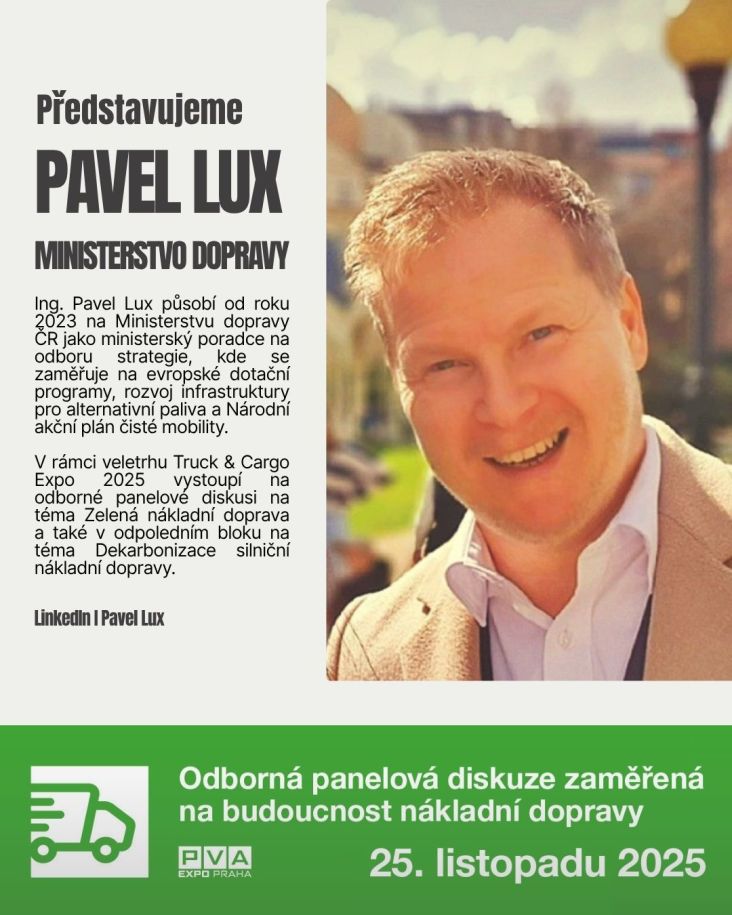 V rámci veletrhu Truck & Cargo Expo 2025 vystoupí na odborné panelové diskusi v dopoledním Bloku I na téma "Zelená nákladní doprava: Dotace a podpora pro elektro, hybridy a infrastrukturu" a také v odpoledním Bloku II na téma "Dekarbonizace silniční nákladní dopravy: Alternativní paliva a řešení budoucnosti".
