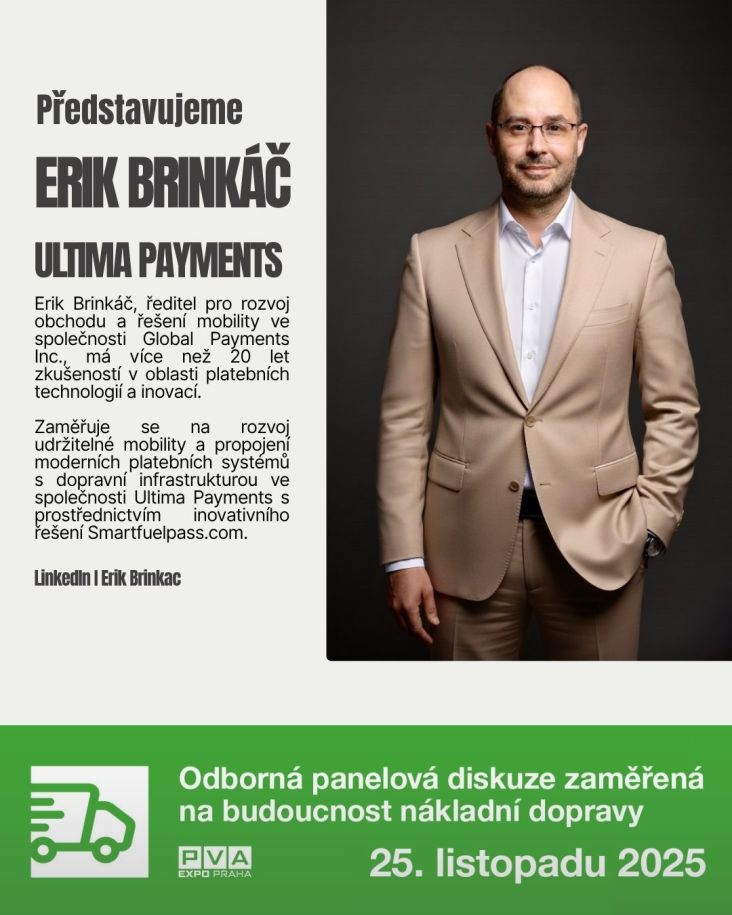 Jedním z řečníků odborného doprovodného programu Truck & Cargo Expo 2025 bude Erik Brinkáč, senior ředitel pro rozvoj obchodu a řešení mobility pro Evropu ve společnosti Global Payments Inc., která patří mezi přední poskytovatele elektronických platebních řešení na světě. Global Payments je členem žebříčků Fortune 500 a S&P 500 a působí ve střední a východní Evropě prostřednictvím společného podniku s ERSTE Bank.
